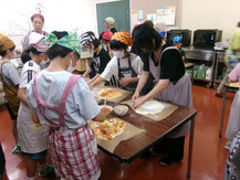 子どもたちはそれぞれ自分のピザを作りました。生地を延ばすのに苦戦する子、生地の上に乗せる具を模様のように並べる子、それぞれ工夫を凝らしたピザができあがりました。