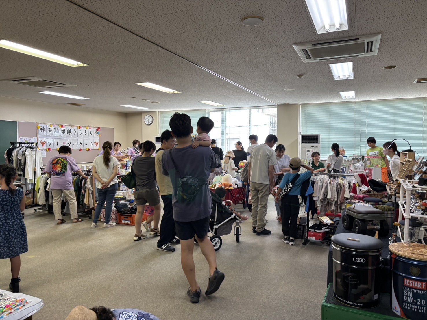 センター横のガレージにゲームコーナーやリサイクル品、手作り小物、美味しい食べ物のキッチンカー並び、いつものフリマとは少し違った雰囲気になりました。